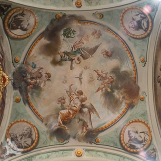 A un lado del salón central se encuentra la capilla, de pequeñas dimensiones, cubierta con una cúpula sobre pechinas y lunetas, decorada también por el Vigatà con una escena de la Virgen de la Merced.